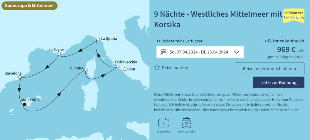 Mit Flug ab nur €1.389. Erlebt ab Palma eine wunderschöne Reise durchs Mittelmeer. Die Route „Westliches Mittelmeer mit Korsika“ führt euch über die Balearen, Italien und Korsika über Barcelona wieder zurück nach Palma de Mallorca.