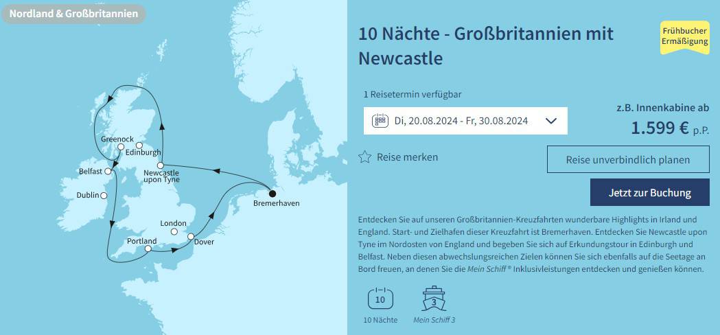 Dieses Angebot inkludiert 11 Tage an Bord der Mein Schiff 3. Von Bremerhaven aus bereist ihr die Route „Großbritannien mit Newcastle“. Dabei erlebt ihr eine traumhafte Kreuzfahrt zwischen Deutschland, England, Schottland und Irland.
