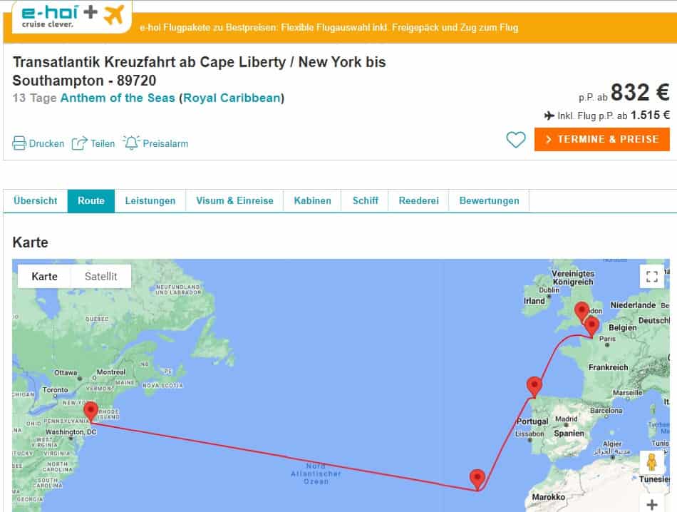 Die Kreuzfahrt beginnt im Hafen von New York in Cape Liberty. Von hier aus steuert ihr beginnend 6 Seetage in Richtung Osten, um auf Madeira anzulegen. Danach steuert in Richtung Spanien und Frankreich um in La Coruna und Le Havre, nahe Paris anzulegen. Danach endet die Kreuzfahrt am letzten Tag in Southampton (England)