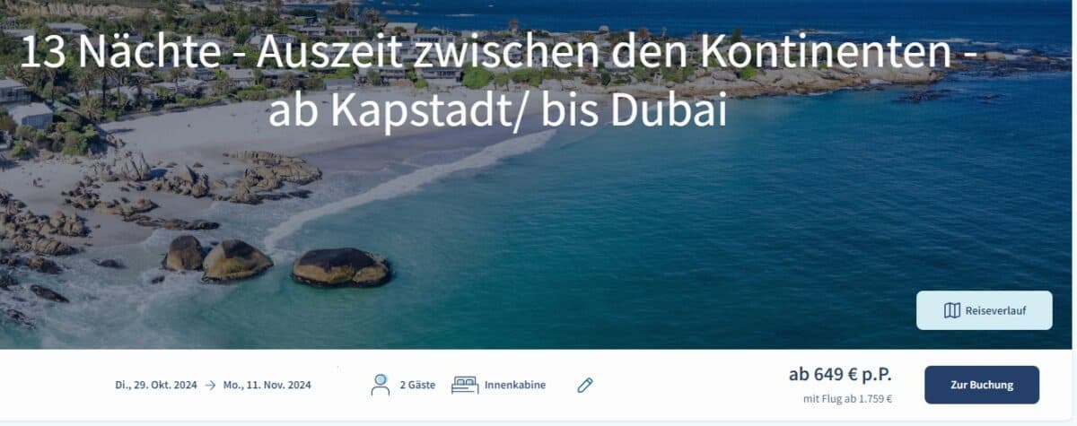 Die Reise beginnt in Kapstadt, einer der schönsten Städte Südafrikas. Hier habt ihr die Möglichkeit, die vielfältigen Sehenswürdigkeiten und Ausflugsmöglichkeiten zu erkunden, bevor ihr in See stecht. Nach zwei Tagen in Kapstadt folgen entspannte Seetage, an denen ihr das umfangreiche Bordprogramm der Mein Schiff 4 genießen könnt. Die Kreuzfahrt endet in Dubai, wo Sie die atemberaubende Architektur und das reiche kulturelle Erbe der Stadt entdecken können.