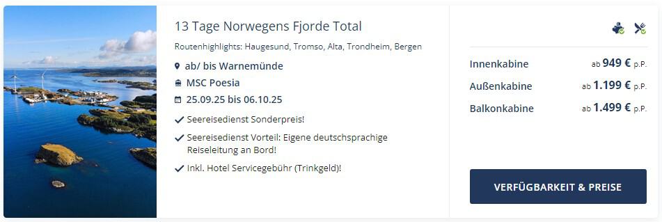 Im September 2025 bietet MSC Kreuzfahrten eine atemberaubende 13-tägige Reise entlang der norwegischen Küste an. Abfahrt und Ankunft sind in Warnemünde/Rostock, was die Anreise besonders bequem macht.