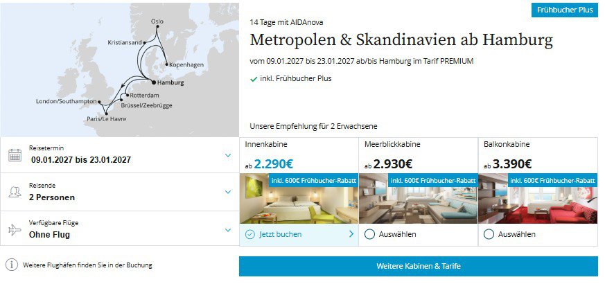Träumt ihr von einer unvergesslichen Reise durch Westeuropa? Begebt euch an Bord der AIDAnova und erlebt in 15 Tagen eine Vielfalt an Kulturen, beeindruckenden Städten und malerischen Landschaften. Von der pulsierenden Metropole Hamburg über charmante Hafenstädte in Dänemark, Norwegen, England, Frankreich und Belgien bis hin zu den modernen Highlights Rotterdams – diese Kreuzfahrt bietet euch unvergessliche Erlebnisse und Entspannung pur.