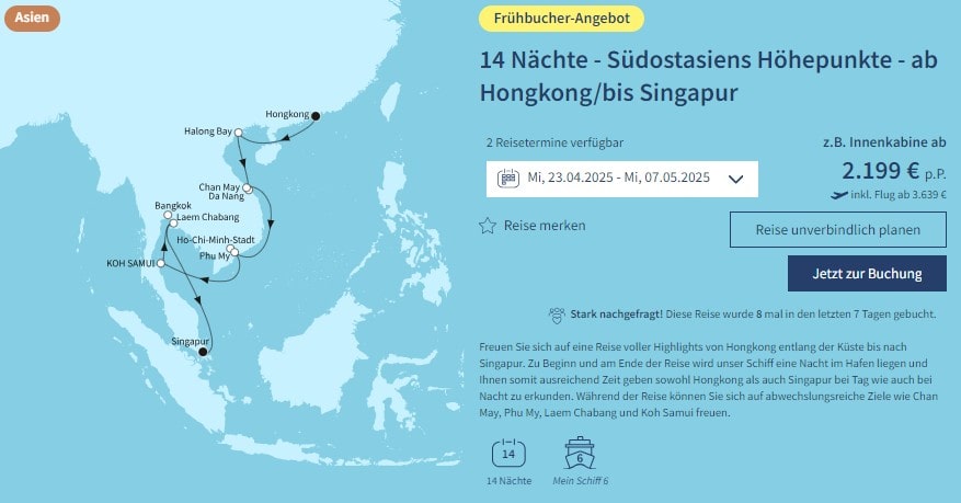Freut euch auf eine Reise voller Highlights von Hongkong entlang der Küste bis nach Singapur. Zu Beginn und am Ende der Reise wird die Mein Schiff 6 eine Nacht im Hafen liegen und euch somit ausreichend Zeit geben sowohl Hongkong als auch Singapur bei Tag wie auch bei Nacht zu erkunden. Während der Reise könnt ihr euch auf abwechslungsreiche Ziele wie Chan May, Phu My, Laem Chabang und Koh Samui freuen.