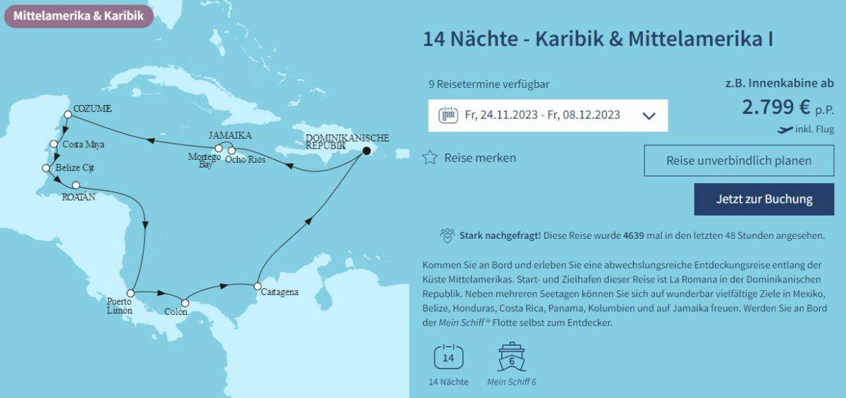 Kommt an Bord und erlebt eine abwechslungsreiche Entdeckungsreise entlang der Küste Mittelamerikas. Start- und Zielhafen dieser Reise ist La Romana in der Dominikanischen Republik. Neben mehreren Seetagen könnt ihr euch auf wunderbar vielfältige Ziele in Mexiko, Belize, Honduras, Costa Rica, Panama, Kolumbien und auf Jamaika freuen.