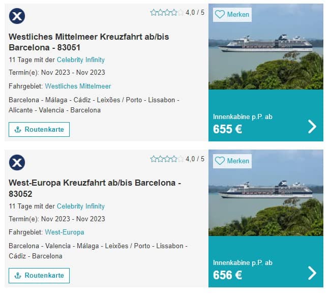 Tipp: Alternativ findet ihr auch eine zweite vergleichbare Route im Angebot. Hier wird der Hafen Alicante durch Cadiz ersetzt.