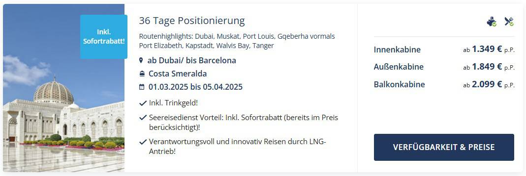 Eine Kreuzfahrt über mehrere Kontinente ist ein Lebenstraum, den man sich nicht oft leisten kann. Doch mit dieser 36-tägigen Teilstrecke der Weltreise der Costa Smeralda könnt ihr diesen Traum wahr machen – und das zu einem beeindruckenden Preis von nur €1.349. Im März und April 2025 führt euch diese Reise von den modernen Metropolen des Nahen Ostens über die exotischen Küsten Afrikas bis ins geschichtsträchtige Europa.