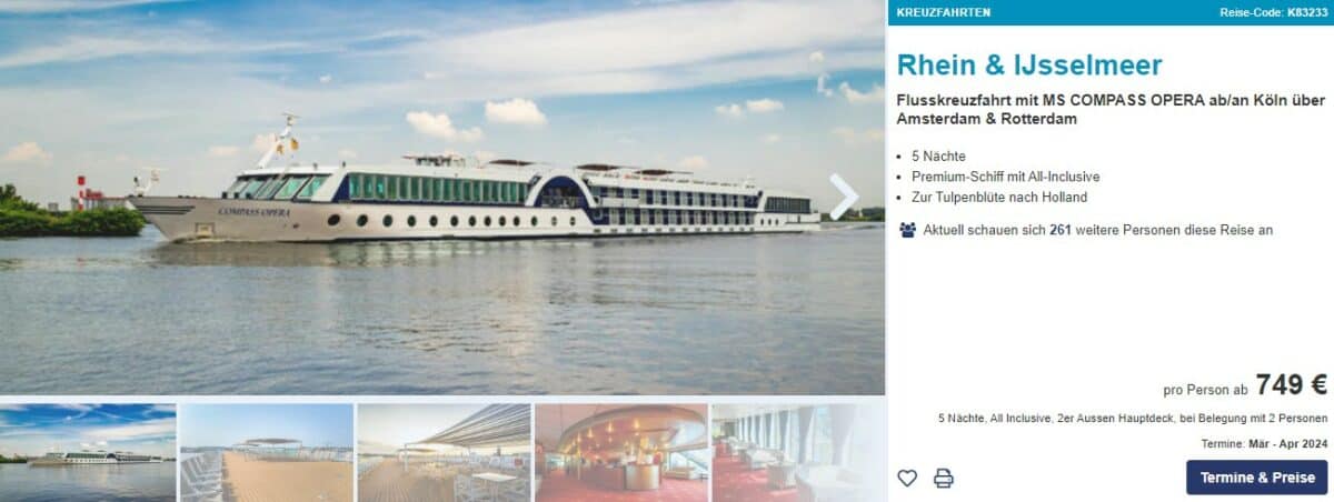 Der Reisepreis inkludiert 6 Tage an Bord der MS COMPASS OPERA mit All Inclusive Verpflegung. Der Reisezeitraum erstreckt sich über den März und April 2024.
