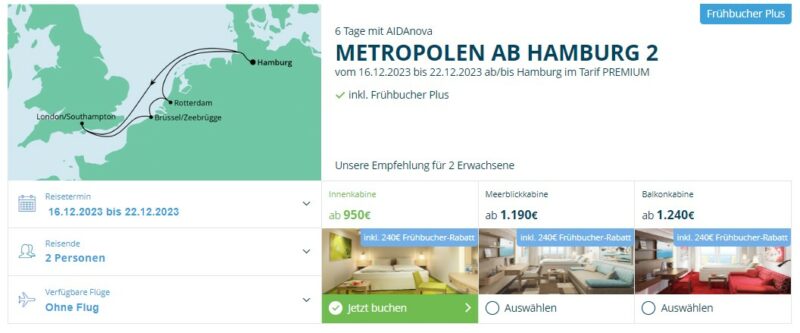 Die Kreuzfahrt startet und endet in Hamburg. Der Reisepreis inkludiert 7 Tage/6 Nächte an Bord der AIDAnova mit Vollverpflegung, Tischgetränke und Trinkgelder. Die Balkonkabine ist ab nur €620 buchbar. Aktuell zum Frühbucher Plus Preis mit €240 Rabatt, im PREMIUM Tarif von AIDA. Der Reisezeitraum liegt in der Vorweihnachtszeit 2023. Achtung es ist nur ein Termin geplant!