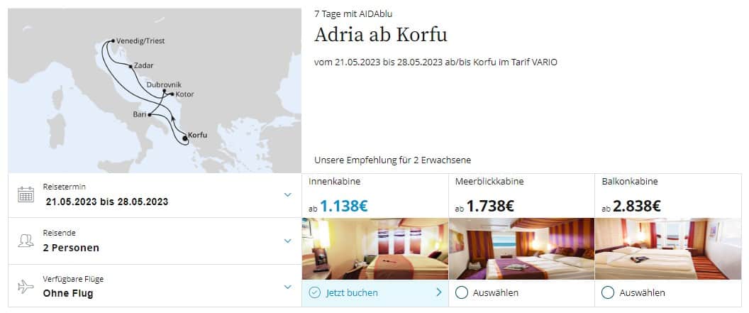 Nach dem Auftakt im Hafen von Korfu, beginnt die Kreuzfahrt mit einem ersten erholsamen Seetag an Bord der AIDAblu. Danach steuert ihr den italienischen Hafen von Triest an. Über Zadar gelangt ihr über den einzigen Fjord dieser REgion nach Kotor in Montenegro. Danach erreicht ihr Bari und kehrt am Ende der Reise nach Korfu zurück.