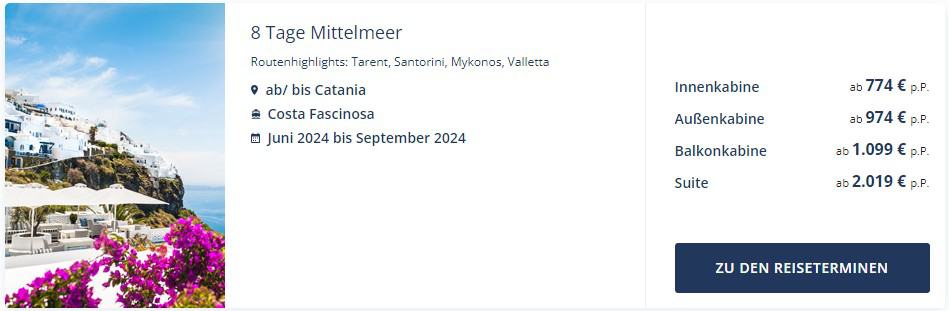 Das Kreuzfahrtschiff Costa Fascinosa schippert in den Sommermonaten 2024 und 2025 von Sizilien aus in Richtung Griechenland und Malta. Genießt die schönsten Häfen und Inseln zu einer perfekten Reisezeit.