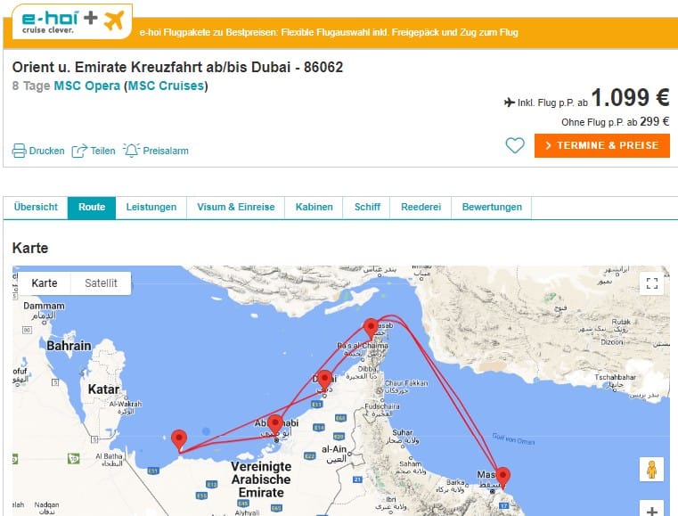 Die Kreuzfahrt startet im Hafen von Dubai mit einer ersten Übernachtung im Hafen. Es bleibt euch hier viel Zeit um die Sehenswürdigkeiten zu besichtigen ehe die MSC Opera Richtung Oman ablegt. Zuerst erreich iht Khasab, danach Maskat. Hier erwartet euch die Hauptstadt des Omans mit den Festungen Mirani und Jalali sowie mit dem Sultanspalast. Nach einem Seetag erreicht ihr dann Abu Dhabi. Wahrzeichen von Abu Dhabi ist das Al Maqtaa Fort und die modernen Sheikh Zyed Moschee. Macht eine traditionelle Dhow Fahrt und entspannt an einem der Traumstrände Abu Dhabis. Weiter geht es auf die Insel Sir Bani Yas (VAE). Hier findet ihr eine naturbelassene Insel vor, mit einem Wildlife Park, wunderschönen Stränden und zahlreichen sportlichen Möglichkeiten wie Mountainbiken, Klettern oder Tauchen. Am Ende der Reise erreicht ihr wieder Dubai, wo das Kreuzfahrtschiff über Nacht im Hafen verweilt.