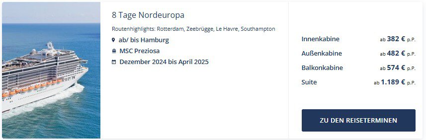 Gönnt euch eine entspannende Kreuzfahrt ab Hamburg mit einem tollen Schiff und wunderschönen Häfen in Westeuropa. Zur Auswahl stehen eine Vielzahl von günstigen Terminen bis April 2025.