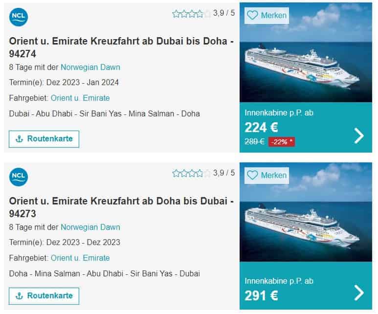 - Silvesterkreuzfahrt ab €224: Die Einschiffung auf das Kreuzfahrtschiff erfolgt am 27.12.2023 in Dubai. Danach steuert ihr bis 3.1.2024 bis nach Doha in Katar. Den Silvesterabend verbringt ihr auf See, mit Kurs auf Sir Bani Yas.