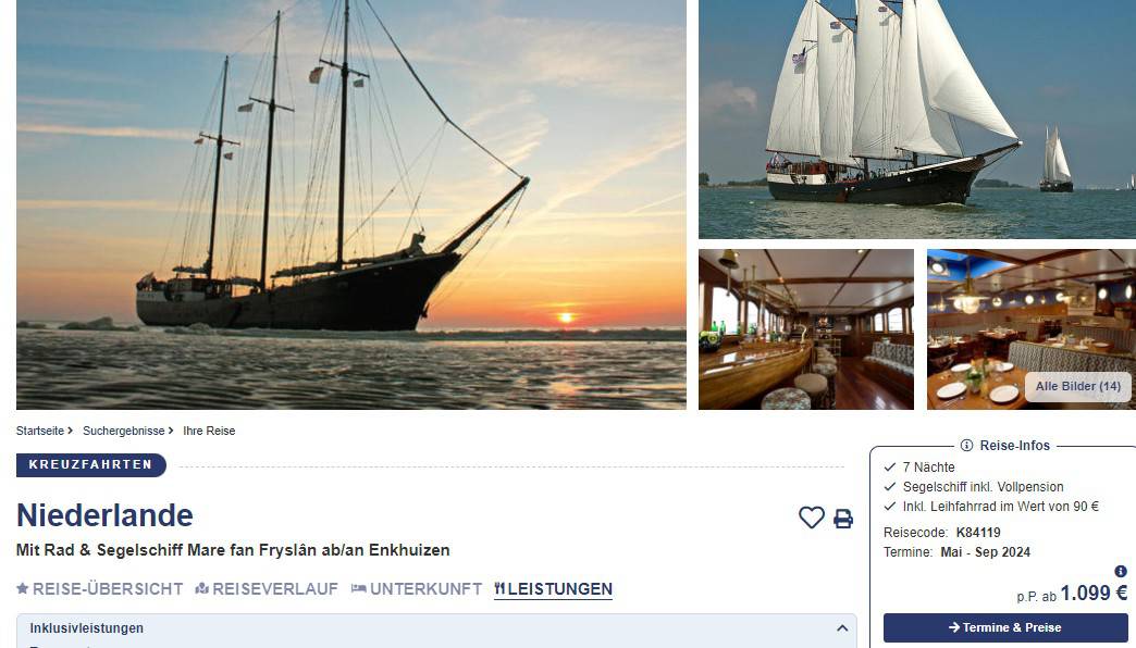 Die Reise startet und endet im wunderschönen Städtchen Enkhuizen am IJsselmeer. Im Reisepreis inbegriffen sind 7 Nächte an Bord des Segeschiffes mit Vollpension, sowie Leihfahrräder im Wert von €90. Der mögliche Reisezeitraum erstreckt sich von August bis September 2024.