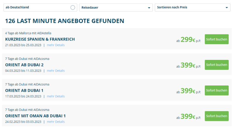 Ihr könnt bei der AIDA Last Minute Übersicht den Filter „ab Deutschland“ setzen, um Kreuzfahrten ab Hamburg, Warnemünde oder Kiel zu buchen. Weites könnt ihr nach „Reisedauer“ filtern und nach Preisen sortieren.