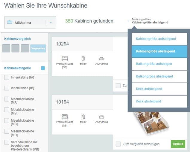 Nach der Grobauswahl beim AIDA Kabinenfinder kann man nun mehrere Funktionen nutzen, um weitere Details zu erhalten: