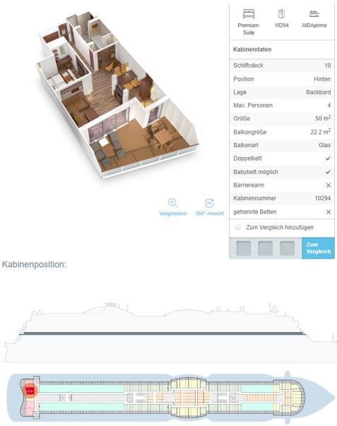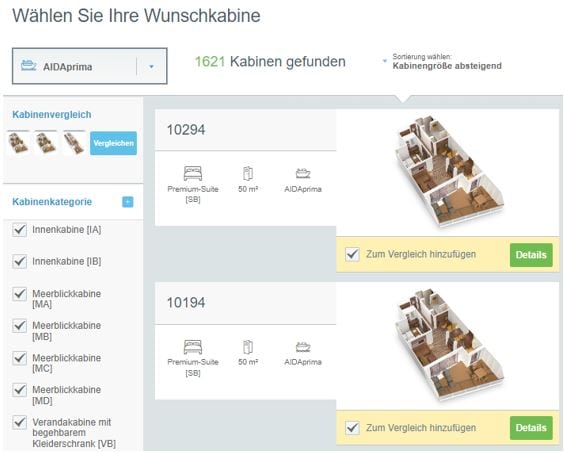 - Hat man mehrere Kabinen gefunden, die einem gefallen kann man über „Zum Vergleich hinzufügen“ diese und weitere auswählen. In der Vergleichsfunktion werden danach alle Daten und Fakten gegenübergestellt.
