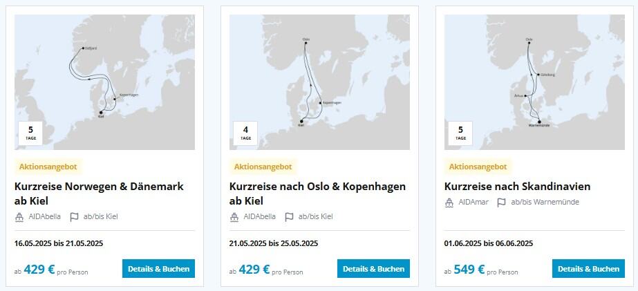 Ihr möchtet AIDA einfach mal ausprobieren oder habt Lust auf ein paar Tage Auszeit? Dann sind die neuen AIDA Kurzreisen 2025 perfekt für euch! Entdeckt faszinierende Städte in Norwegen, Dänemark, Schweden, Polen oder Schottland – und genießt dabei das entspannte AIDA Gefühl an Bord. Jetzt gibt es wieder tolle Angebote ab Kiel auf AIDAbella, AIDAmar und AIDAluna.