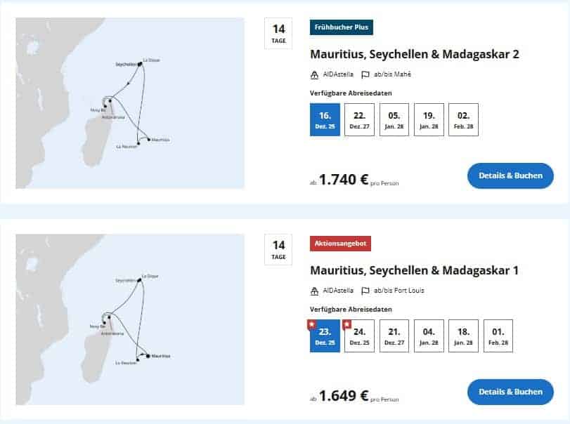 Wer von türkisblauem Wasser, exotischen Inseln und tropischer Natur träumt, bekommt mit diesem AIDA-Deal eine außergewöhnliche Möglichkeit. Zur Auswahl stehen die Routen: Mauritius, Seychellen & Madagaskar 1 und Mauritius, Seychellen & Madagaskar 2.