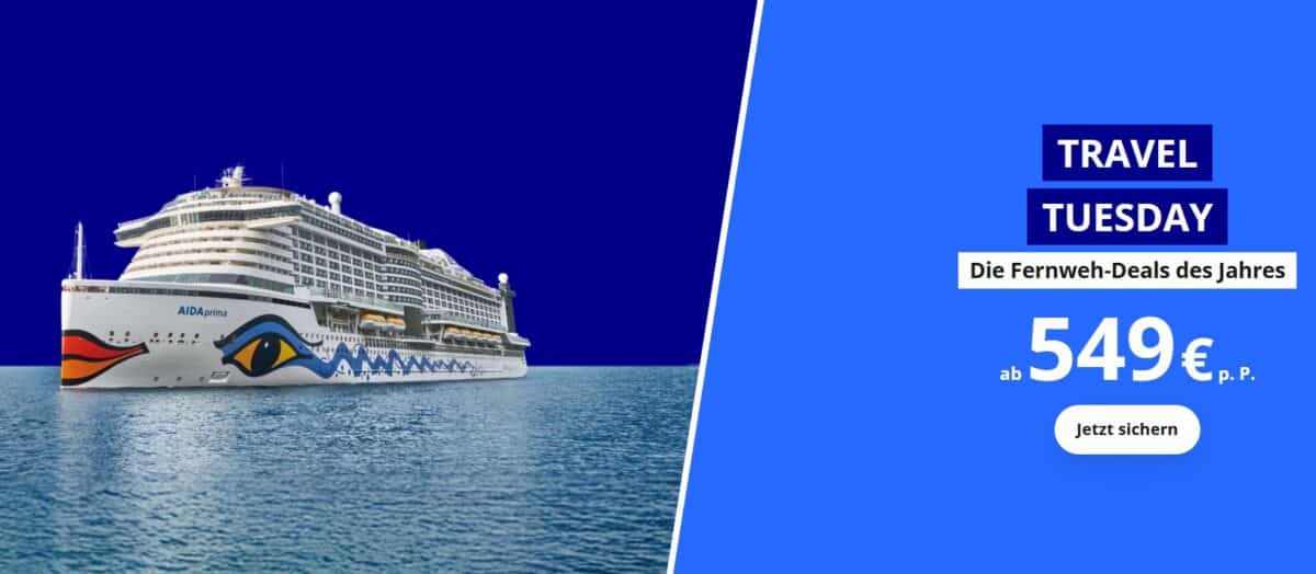 Nur bis 10. Dezember 2025 ! Der Black Friday ist vorbei – aber eure Chance auf Traumreisen zu Traumpreisen geht weiter! Zum ersten offiziellen AIDA Travel Tuesday erwarten euch exklusive Frühjahrs-Deals für 2026. Ob Kurzreise, Nordeuropa, Kanaren, Mittelmeer oder Karibik: Jetzt ist genau der richtige Moment, um eure Frühlingsreise mit AIDA zu sichern.