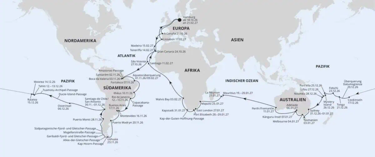 - Hamburg → Mauritius | 93 Tage | 18.10.2026 – 19.01.2027