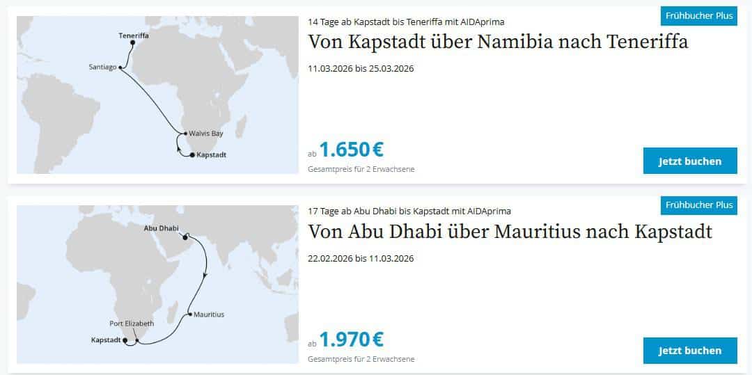 AIDAprima startet am 3. Oktober 2025 von Hamburg aus in Richtung Orient. Auf dem Weg dorthin umrundet das Kreuzfahrtschiff das Kap der Guten Hoffnung, bevor die Glitzerwelt der Emirate am Bug auftauchen. Die Reisen bieten eine Mischung aus kultureller Vielfalt, natürlicher Schönheit, echtem Seefahrerfeeling und exklusivem Komfort.