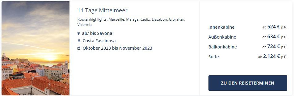 Die Innenkabine ist ab €524 buchbar, die Außenkabine ab €634, die Balkonkabine ist ab €724 zu ergattern. Die entsprechende Vollverpflegung an Bord, sowie das Trinkgeld ist im Reisepreis inklusive.