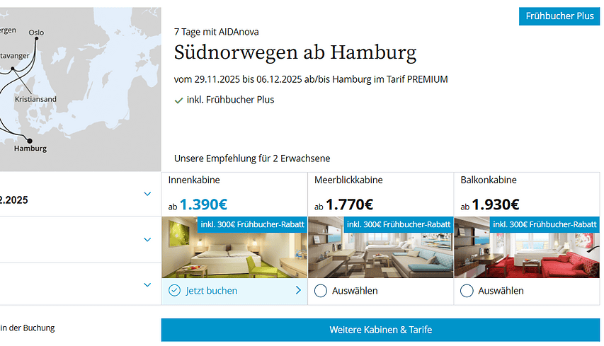 Vollverpflegung an Bord, sowie Trinkgelder für die Crew im Wert von €84 sind im Reisepreis bereits inbegriffen. Der Reisezeitraum liegt im Hochsommer und in der Ferienzeit August 2026.
