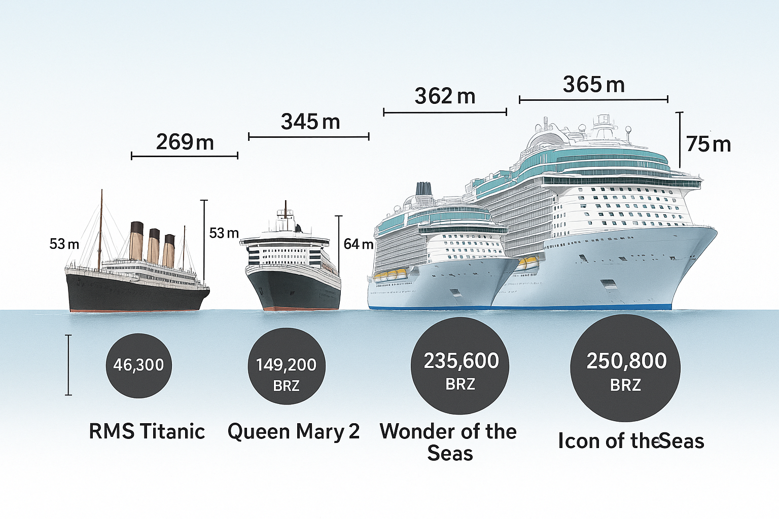 → Nein, sie war nur etwa ein Fünftel so groß wie die heutigen Icon-Class-Schiffe.