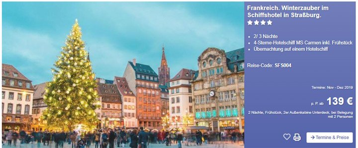 Was für eine geniale Idee. Kombiniert eine Städtereise zur Vorweihnachtszeit mit dem Kreuzfahrtfeeling auf dem Hotelschiff. Eine tolle Idee, auch perfekt als Geschenk geeignet! Verbringt die Vorweihnachtszeit in einer der schönsten Städte der Welt – Straßburg. Hier lernt ihr nicht nur die Stadt kennen, ihr besucht auch den ältesten Weihnachtsmarkt Frankreichs.