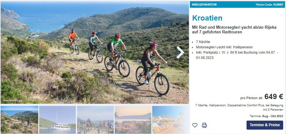 Zur Auswahl stehen zwei verschiedene Angebote. Wahlweise könnt ihr dabei die Motorsegler Reise ab Rijeka, oder ab Trogir antreten. Als besondere Draufgabe ist auch das Leihfahrrad, ein Trekkingbike, im Angebot inkludiert. Ihr findet zwischen April und Oktober eine ganze Reihe von Terminen zum richtig starken Preis.