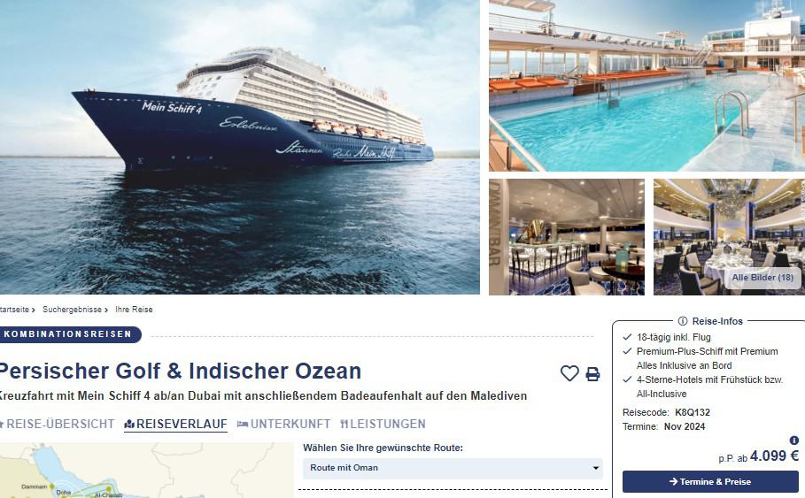 Diese Kreuzfahrt & Baden Reise startet in Dubai. Nach einer Nacht im Hotel geht es an Bord eures Kreuzfahrtschiffes, der Mein Schiff 4 von TUI Cruises. Wählt zwischen den Routen Katar oder Oman und lasst den Traum von 1.001 Nacht Wirklichkeit werden. Im Anschluss erholet ihr euch bei einem unvergesslichen Badeurlaub auf den Malediven. Der Reisezeitraum liegt in den Herbst und Wintermonaten 2024.