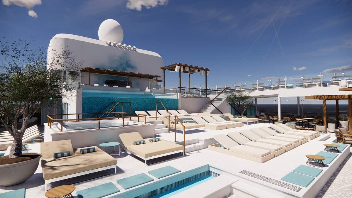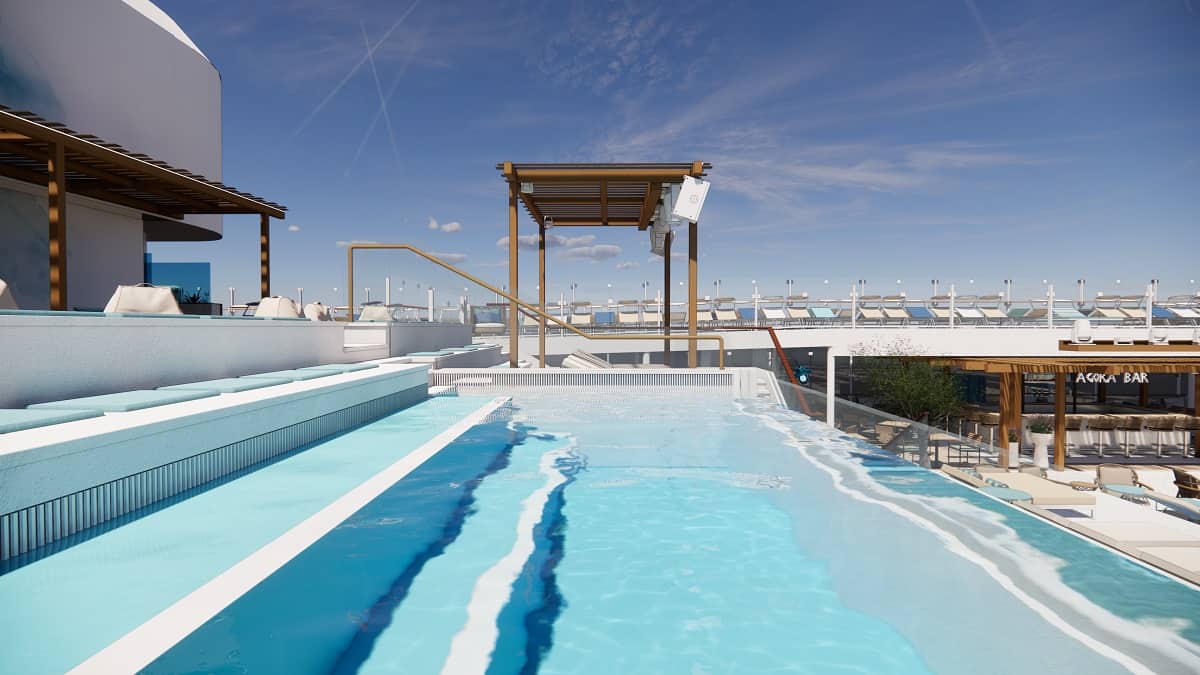 Das achte Schiff hält viele Überraschungen bereit: Freiraum neu erleben können die Gäste auf dem Neubau beispielweise durch die weitläufigen, zusammenhängenden Außendecks. Schon weithin sichtbar ist das neue, ikonische Dach über Teilen des 25 Meter Pools und der Sonnenbereiche. Dieses architektonisch spektakuläre Dach, das dank Struktur wie ein Flechtwerk auch luftigen Schatten für individuelle Entspannungs-Bereiche bietet, ist einer Grotte nachempfunden, durch die das Licht aufs Wasser fällt. Auch Teile der Joggingstrecke sind schwebend in diesen Außenbereich integriert.