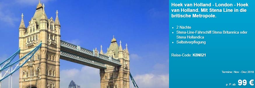 Die Reise startet und endet im Hafen von Hoek van Holland (Niedelande). Ihr legt am Abend um 22 Uhr ab und schippert während der Nacht in Richtung Harwich (Großbritannien). Ihr legt bereits um 6:30 an und startet somit ganz früh in den Tag. Von Harwich aus bringt euch die inkludierte Zugfahrt nach London. Ihr habt nun den ganzen Tag Zeit die Stadt zu erkunden. Nach einem tollen Tag mit Sightseeing geht es am Abend zurück an Bord und auf den Heimweg. Auf der Schifffahrt nach Hoek van Holland habt ihr Zeit, die Eindrücke Revue passieren zu lassen und die Einrichtungen an Bord zu nutzen. Bitte beachtet, dass die Verpflegung nicht inklusive ist!
