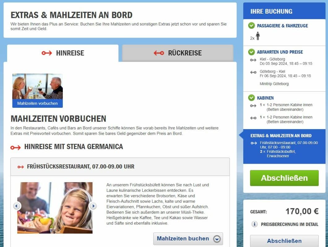 Der Reisepreis gilt pro Erwachsenen in der Innenkabine, ohne Verpflegung. Optional könnt ihr für höhere Kabinenkategorien aufzahlen, sowie Verpflegung zubuchen. Der Reisepreis für 2 Erwachsene für eine Hin- und Rückfahrt inklusive Frühstück beträgt beispielsweise in Summe €170. Weiters ist die Fährüberfahrt natürlich auch mit PKW und Wohnmobil buchbar. Dieser Stena Line Deal ist auch bekannt von diversen Aldi Reisen Angeboten.