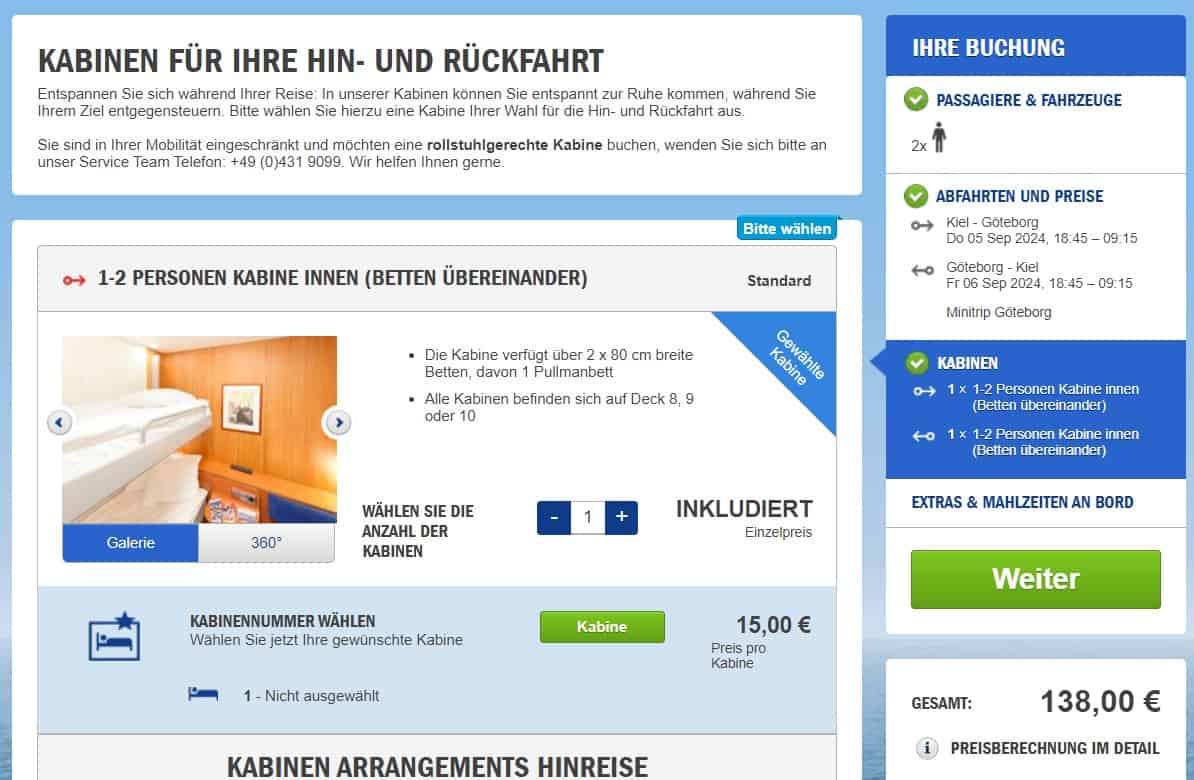 - Danach könnt ihr die genaue Kabine wählen, sowie optional auch Verpflegung zubuchen.