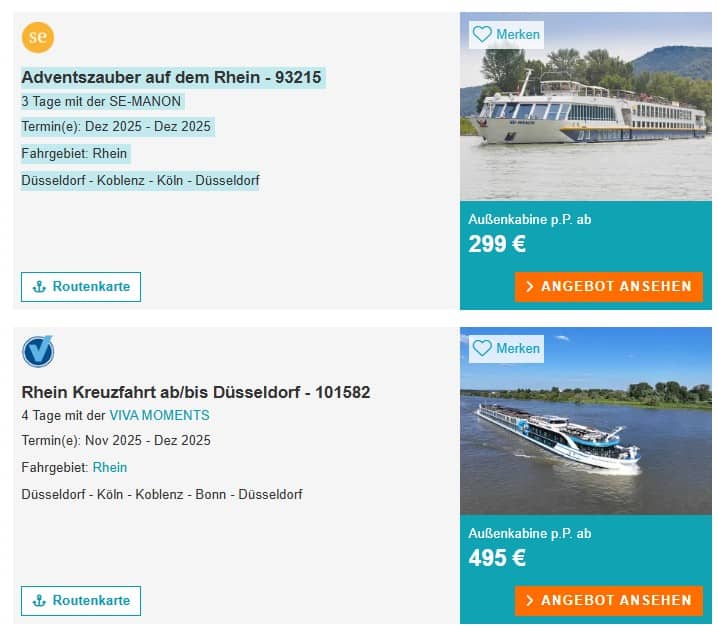 Die günstigste Reise ist derzeit eine 3 tätige Adventreise an Bord der SE-MANON von SE-TOURS. Diese führt von Düsseldorf über Koblenz und Köln retour nach Düsseldorf.