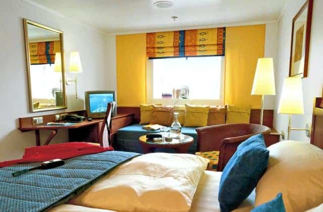 - Außenkabine: Kabinengröße bis zu 3 Personen mit ca. 13,5-17 m² – Fenster – Doppelbett oder 2 untere Betten, teilweise 3./4. Bett – Bad mit Dusche und WC – Täglich frische Handtücher – Haartrockner – Tisch und Stuhl – Sat-TV – Radio – Telefon – Safe – Individuell regulierbare Klimaanlage