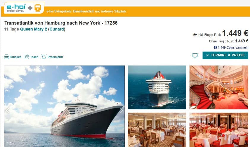 Alternativ könnt ihr diese Kreuzfahrt von Southampton (England) nach New York antreten. Die 8 tägige Reise ist ab nur €890 ohne Rückflug buchbar. Und in die Gegenrichtung von New York nach Southampton könnt ihr ab nur €926 reisen.