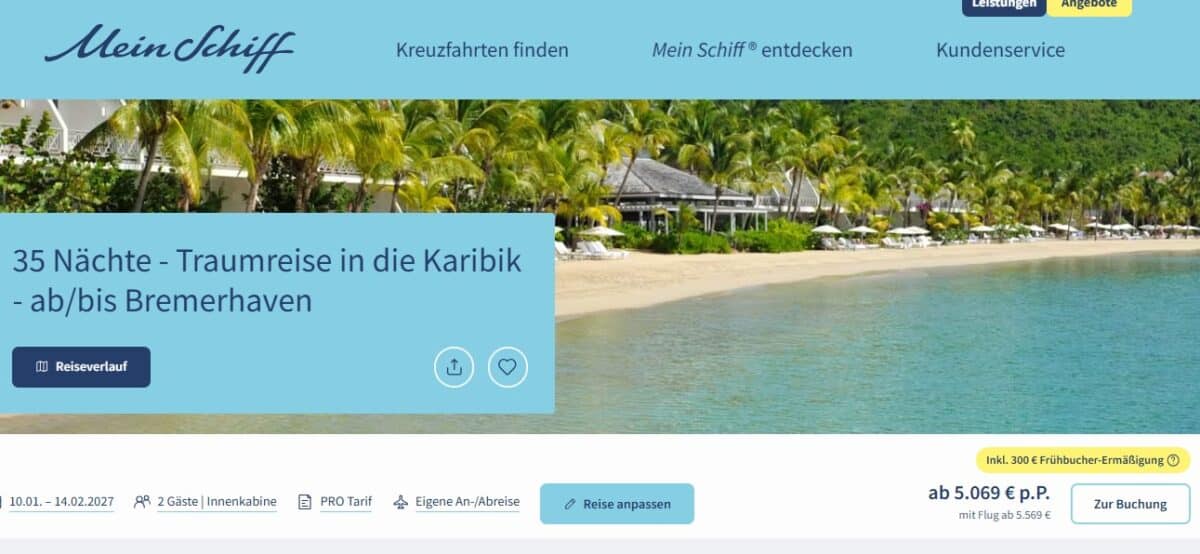 Aktuell mit €300 Frühbucher Ermäßigung! Eine Karibik-Kreuzfahrt ohne Flug, direkt ab Deutschland: Mit der Mein Schiff 3 geht es auf eine außergewöhnliche 35-nächtige Traumreise ab und bis Bremerhaven. Diese Langzeitkreuzfahrt verbindet entspannte Seetage, eine klassische Transatlantikpassage und intensive Karibik-Erlebnisse – ideal für alle, die dem Winter in Europa entfliehen möchten.