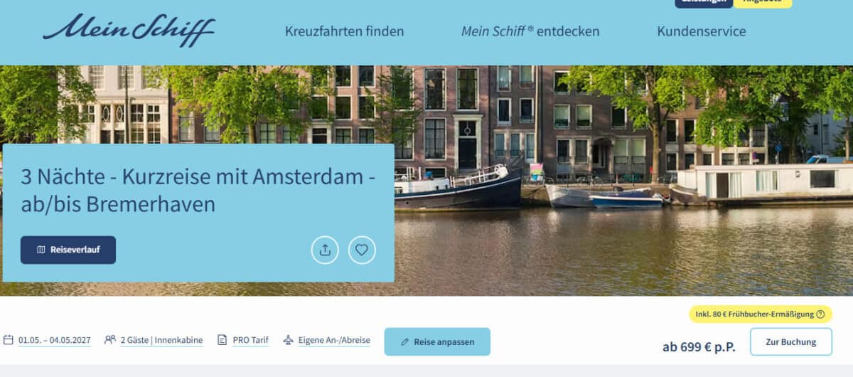 Schnappt euch eine TUI Cruises Kurzreise ab Bremerhaven – ganz ohne Flug, direkt los! Mit der Mein Schiff 3 geht es für 4 Tage / 3 Nächte nach Amsterdam und zurück.