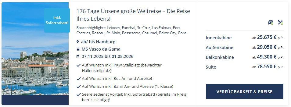 Der Reisepreis gilt pro Person in der Innenkabine und inkludiert einen bewachten PKW Stellplatz. Auf Wunsch könnt ihr auch ein Bus oder Bahn Anreisepaket zubuchen. Die Balkonkabine ist ab €49.300 pro Person buchbar. Der Reisezeitraum ist vom 7. November 2025 bis 1. Mai 2026.
