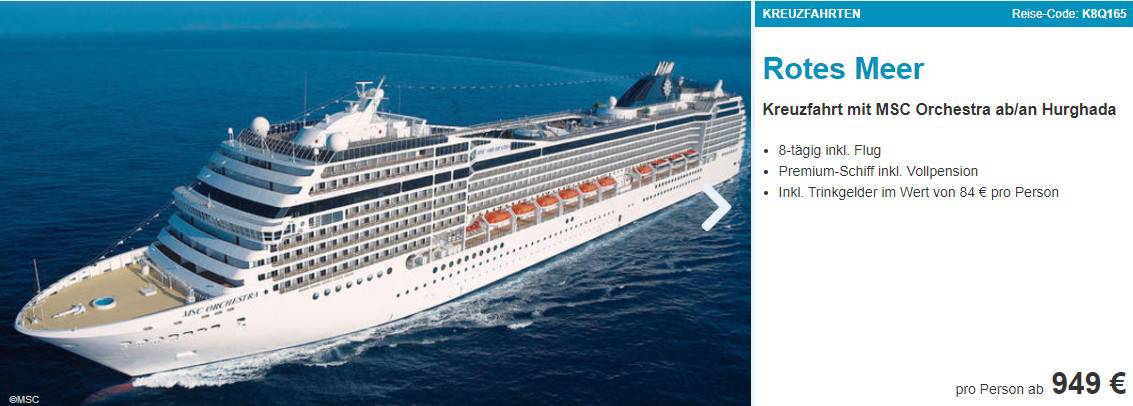 Die MSC Orchestra bereist in dieser Wintersaison das Rote Meer. Die Kreuzfahrt startet und Endet ihr Safaga, nahe Hurghada und steuert von hier aus weitere ägyptische Häfen, Saudi Arabien und Jordanien an.